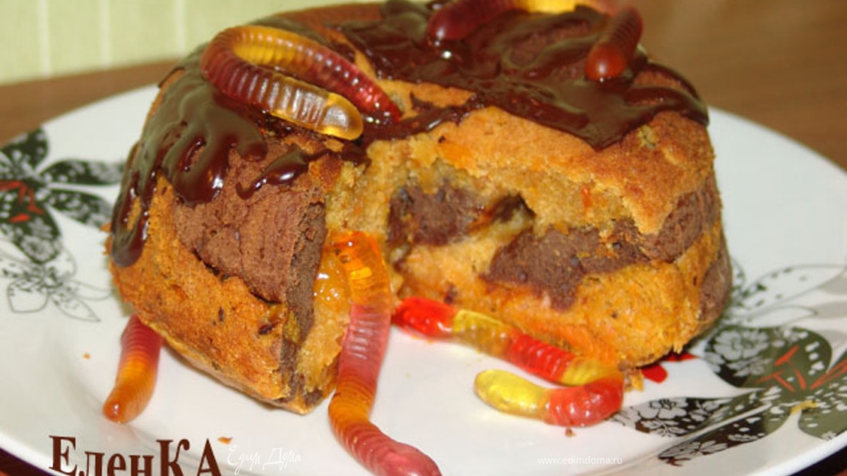 Выпекать при 180С на 35-45 минут. Поливаем растопленным черным шоколадом и украшаем червячками.