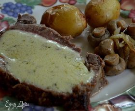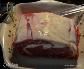 Разогреть духовку до 210 гр. Смазать говяжий кусок кисточкой олив.маслом. Посолить и поперчить.