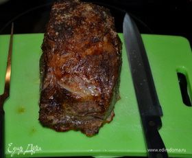 Поставить в духовку на 45 мин. или дольше, если любите прожаренное мясо. Проверяем на готовность спец. термометром. Достанем готовое мясо из духовки,дадим отдохнуть остынуть 10 мин. Разрежем порционно.