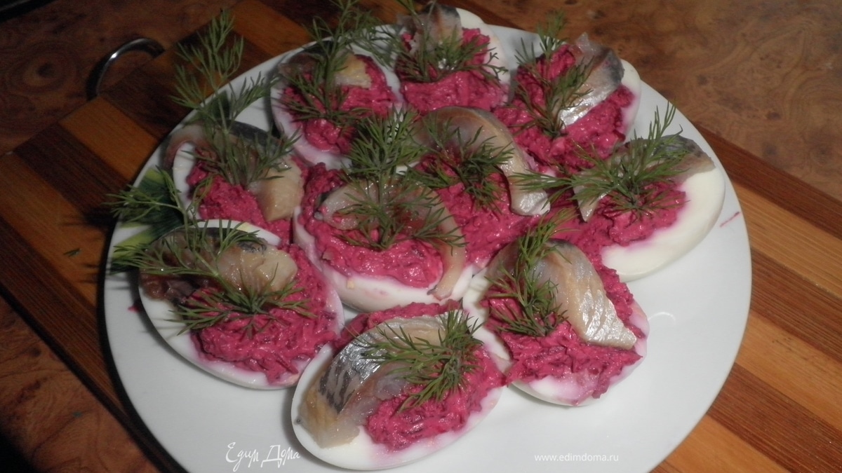 В яйцо положить начинку из свеклы, кусочек сельди и украсить укропом.