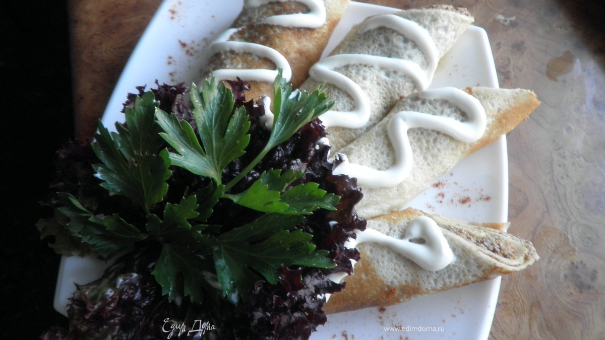 На разогретую сковороду выложить лук и морковь. Через 5 мин. добавить печень. Накрыть крышкой и тушить 15 мин. Посолить и приправить по вкусу. Дать остыть. Затем пропустить все через мясорубку. Добавить размягченное сливочное масло и тщательно перемешать. - Шаг 2Часть паштета равномерно распределить по всему блинчику тонким слоем. Свернуть трубочкой и разрезать наискось посередине. Сверху полить сметаной.