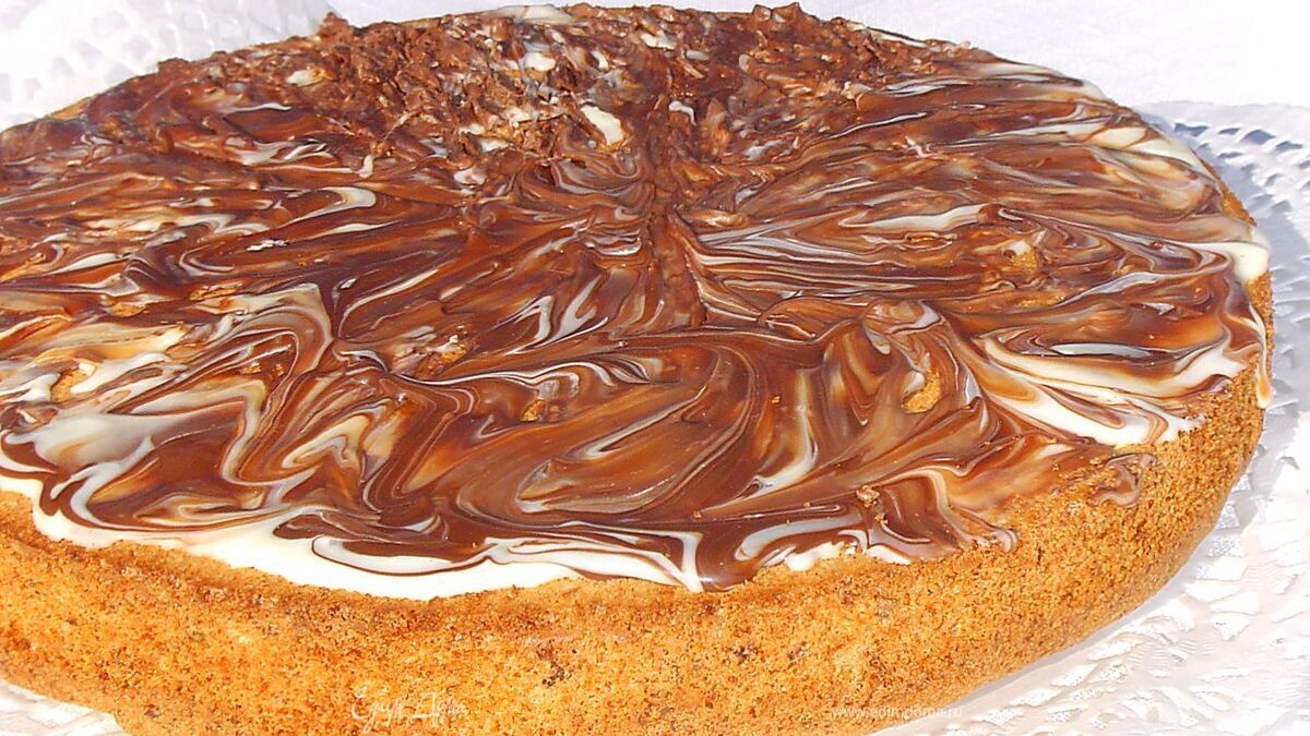 Пока пирог остывает готовим глазурь. Сливки нагреваем до 90 гр., но не кипятим, делим на две равные части. В одну часть кладем измельченный черный шоколад, в другую - белый, размешиваем до тех пор, пока шоколад полностью растопиться. Даем глазури немного застыть и наносим на пирог. - Шаг 8