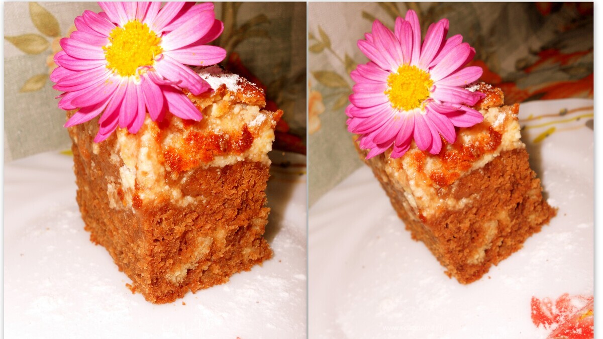 кладем творожную массу поверх шоколадной и немного перемешать ножом обе массы, выпекать около 35 мин. при т. 180-190 гр. до золотистой корочки, достать из духовки, полностью остудить в форме, затем извлечь на тарелку, приятного всем чаепития.....