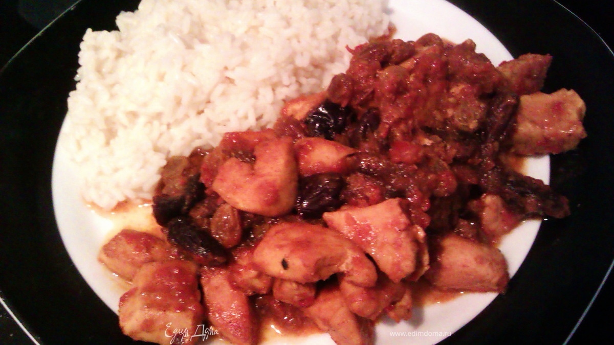 Курица по-мароккански с черносливом, изюмом, медом и корицей