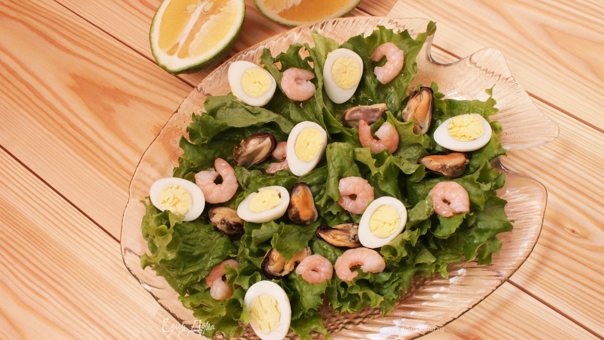- ПодготовкаЛистья салата помыть,порвать руками, выложить на него креветки, мидии, варённые перепелинные яйца, посолить морской солью, сверху выжать лимон.