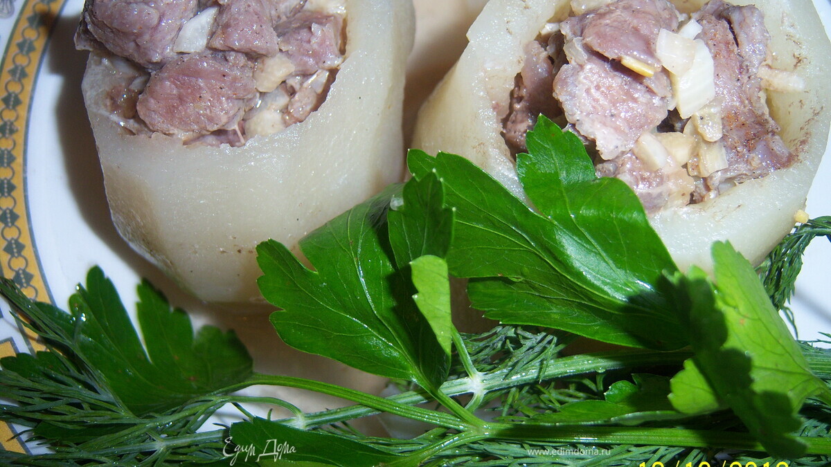 фарш перемешать и начинить им картофель, накрывая клубни нарезанными "крышечками" - Шаг 3