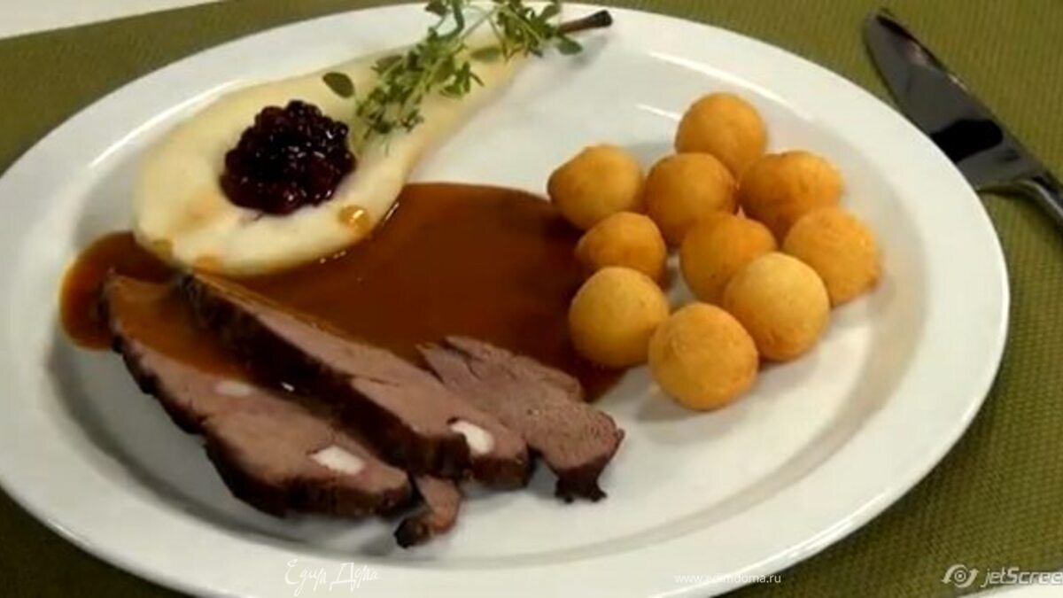Нарежьте готовую оленину ломтями, гарнируйте кусочками груши, клюквенным вареньем и украсьте веточкой тимьяна. Подавать хорошо с картофельными крокетами.
