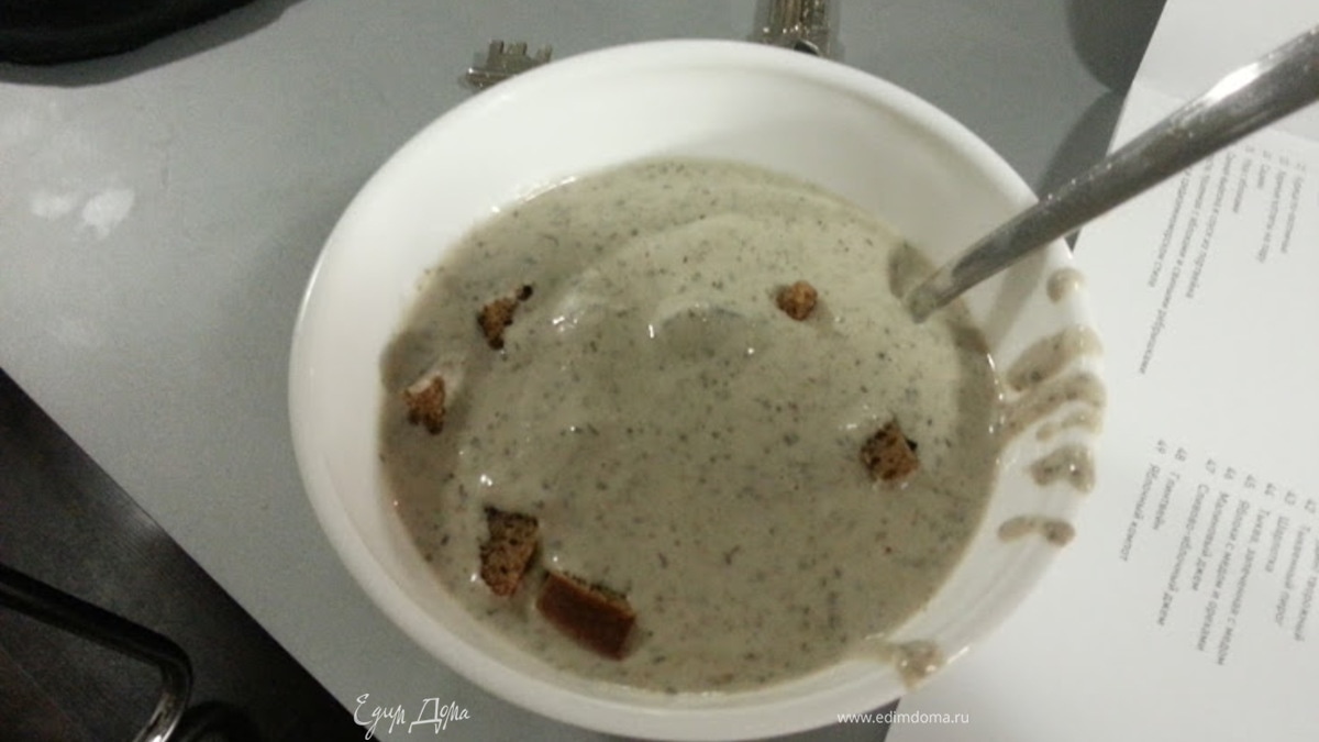 Когда лук станет золотистым, добавляем грибы, подсаливаем, добавляем измельченный зубчик чеснока, включаем режим "обжаривание" на 15 минут. Крышку можно закрыть. Если жидкость из грибов выкипела, значит готово. Теперь это все кидаем в блендер, вместе с картошкой и курицей. Добавляем сливки. Включаем на 1-й (более слабый) режим и перемешиваем до однородной массы, но не до "муки". - Шаг 3Пока мешается, нарезаем хлеб маленькими кусочками, кладем в мультиварку, ставим режим "духовка" или "выпечка" на 8 минут. Делаем сухарики. Смесь выливаем в мультиварку и ставим режим "варка". Крышку не закрываем!! Ждем когда начнет подниматься пенка, до кипения не доводить. Блюдо готово. В тарелку добавляем сухарики.