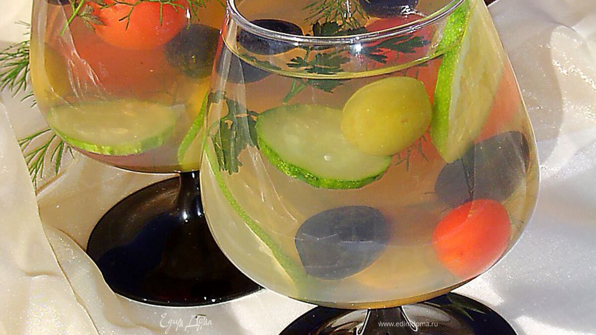 Подготовленные овощи делим на две части и ими заполняем бокалы, добавляем заливку и ставим в холодильник до полного застывания. - Шаг 3