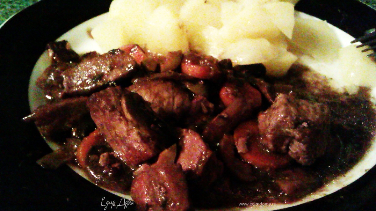 Винная курочка по-бургундски с шампиньонами и оливками