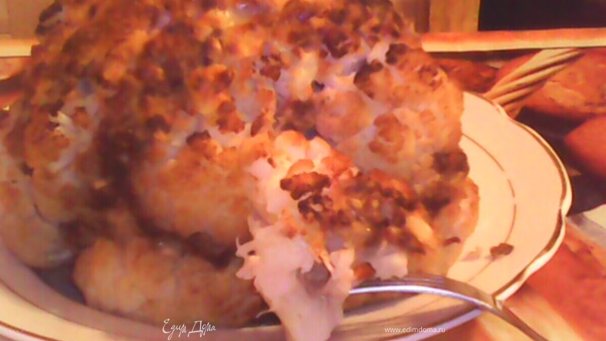 цветную капусту отварить целиком в течении минут 5 -10, не более, чтобы капуста не разварилась.