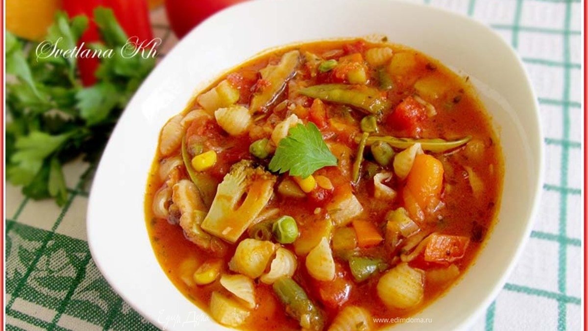 Очень популярный в Италии, легкий овощного суп. Суп минестроне получается очень красивый и разноцветный – детям понравится. Как и многое в итальянской кухне, готовится он из всех разноцветных овощей, что есть в холодильнике. Унылой осенью очень поднимает настроение – попробуйте сами.