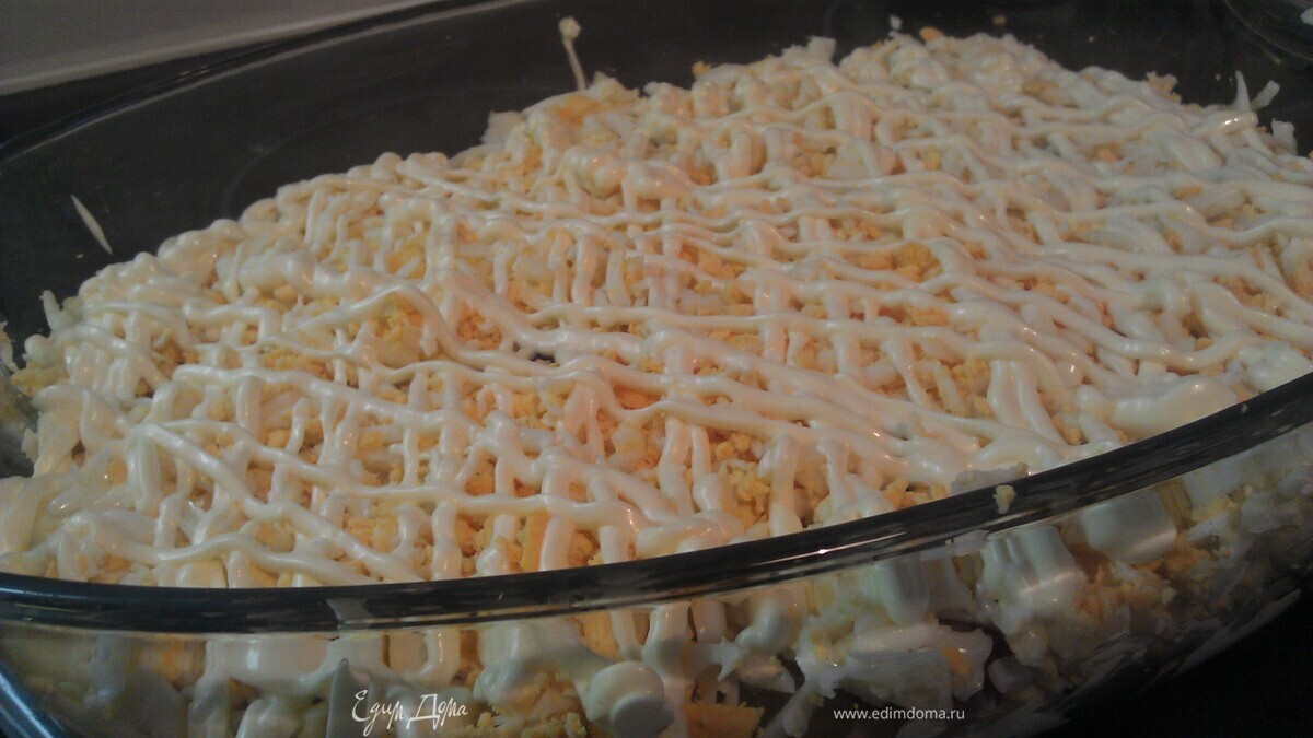 - Шаг 6Натереть на крупной терке половину яиц. Сделать тонкую майонезную сетку.