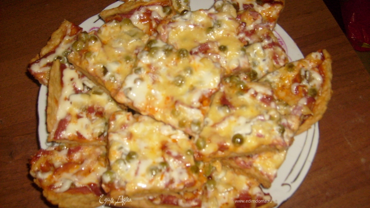 - Шаг 1Далее, на смазанный маргарином противень распределить тесто ровным слоем, смазать соусом или кетчупом и выложить продукты - нарезанные колбасу и огурцы, зелёный горошек и сверху натёртый сыр.