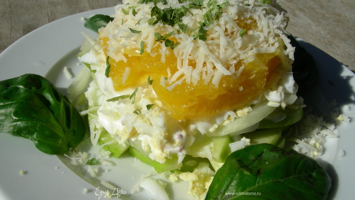 Можно выкладывать салат слоями: яблоко, лук, яйца, апельсины. Каждый слой промазываем заправкой. Сверху посыпаем сыром и украшаем зеленью по вкусу. Такой салат удобно собирать в железном кольце, удалив его в конце. А можно просто все перемешать. Приятного аппетита)