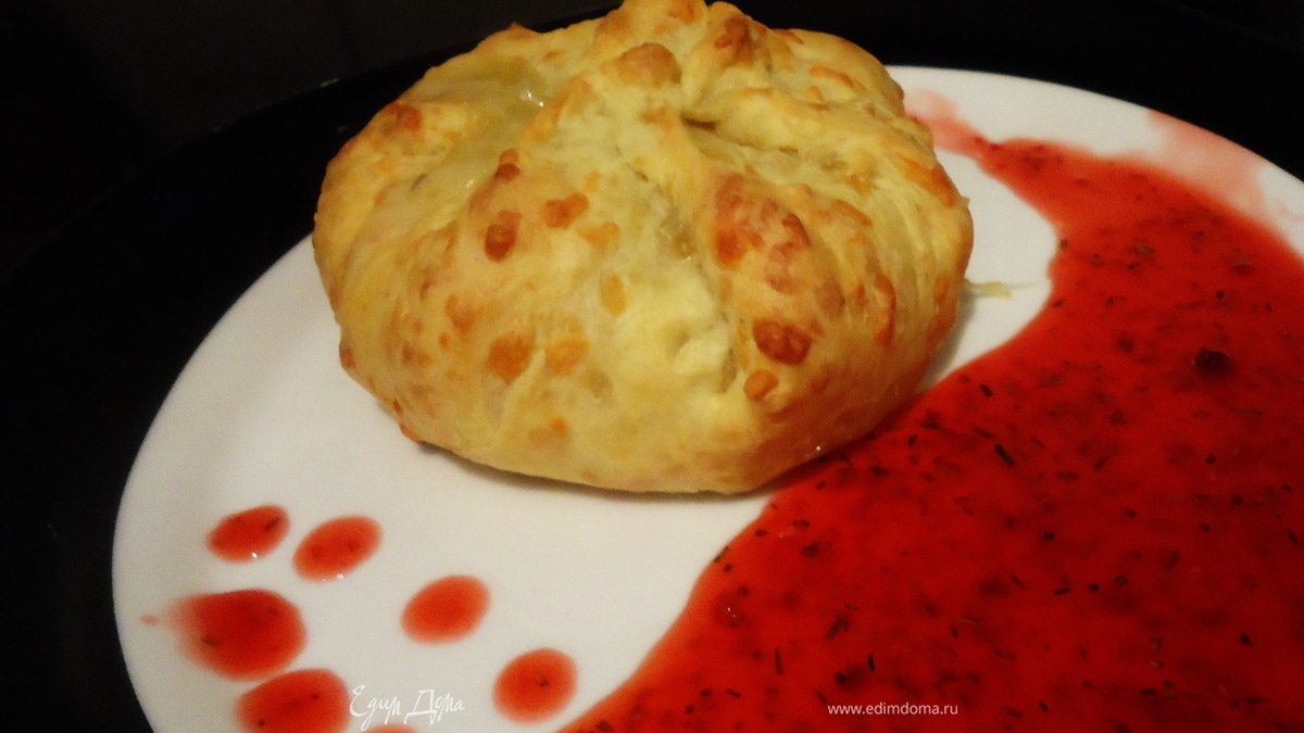 Выкладываем сырные мешочки на тарелку, поливаем соусом. В рецепте советовали их охладить 15 мин, тогда сыр немного загустеет. Но мы проигнорировали этот момент и подождали минут 5, пока ели суп-велютэ из шампиньонов. В итоге при первом же надрезе сыр вытек на тарелку. Но это нисколько не испортило блюдо. Просто пришлось отрезать тесто по кусочку и обмакивать со всех сторон в камамбере. Вот такой небольшой французский ужин получился=)) Bon appétit mesdames et messieurs!!!