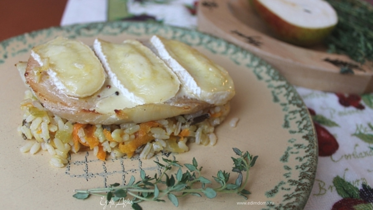 Тилапия с винными грушами на рисовой подушке