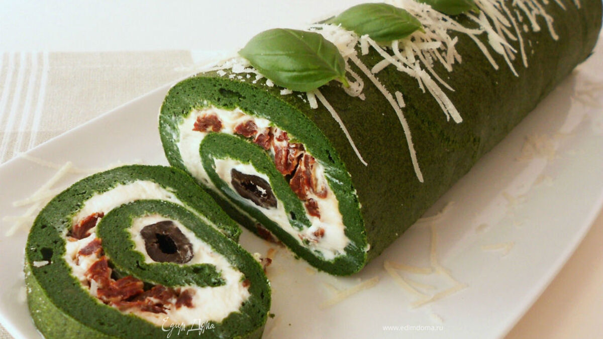 - Шаг 7Равномерно разложить нарезанные полосками томаты, а вяленые маслины в ряд у внутреннего края. Свернуть рулет и убрать в холодильник на 1,5-2 часа. Пармезан натёрла на крупной тёрке, посыпала на готовый рулет+ базилик.
