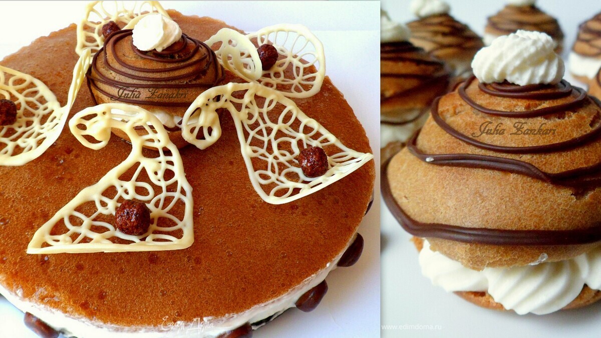 Мини-торт из мокко-профитролей со сливочным кремом, кофейным муссом и белым шоколадом.Плюс мокко-профитроли.