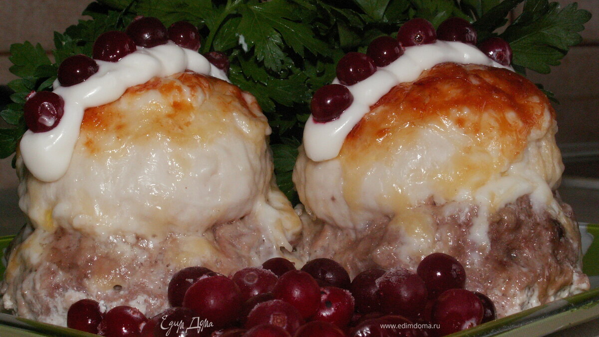 - Шаг 1Хлеб очистить от корочки и замочить в молоке. Добавить половину хлеба в мясной фарш,туда же добавить прокрученную через мясорубку луковицу,посолить,поперчить.Вбить яйцо,хорошо размешать фарш. В куриный фарш добавить оставшийся хлеб,раздавленный через пресс чеснок,размягчённое сливочное масло,яйцо,посолить и поперчить. Грибы отварить в подсоленной воде,с добавлением лаврового листа и перца горошком в течении 15 минут.Можно купить уже готовые грибы (консервированные,но обязательно они должны быть целиковыми). Мясной фарш разделить на шесть частей,куриный тоже разделить на шесть частей. Из мясного фарша сформировать шарики,выложить их в форму для запекания (с бортиками),пальцами сделать углубление посередине. Из куриного фарша сформировать шарики,внутрь каждого положить по целому грибочку. Куриный шарик положить на мясной. Сверху полить майонезом и посыпать тёртым на самой мелкой тёрке сыром. В форму налить сливки. Готовить в предварительно нагретой до 190 градусов духовке около 45-50 минут. Если сыр у вас зарумянится раньше,просто прикройте форму фольгой. Получилось настолько вкусно,что я даже не ожидала. Попробуйте и вы! Приятного вам аппетита!