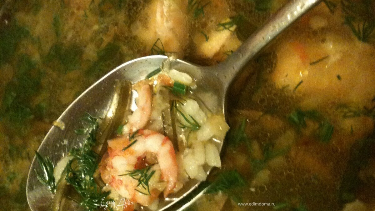 - ПодготовкаСварить бульон из кусочка семги. Вытащить ее из бульона. Положить в бульон рис и морскую капусту (у меня в морозилке всегда есть готовая). Приготовить заправку - спассеровать лук с моркойвью и заправить ей супчик. В суп положить разделанную на кусочки рыбу без костей. Приправить перчиком молотым, солить по вкусу. По окончанию приготовления риса положить в суп немного оччищенных креветок. Дать закипеть и убрать с плиты. Заправить зеленью укропа.