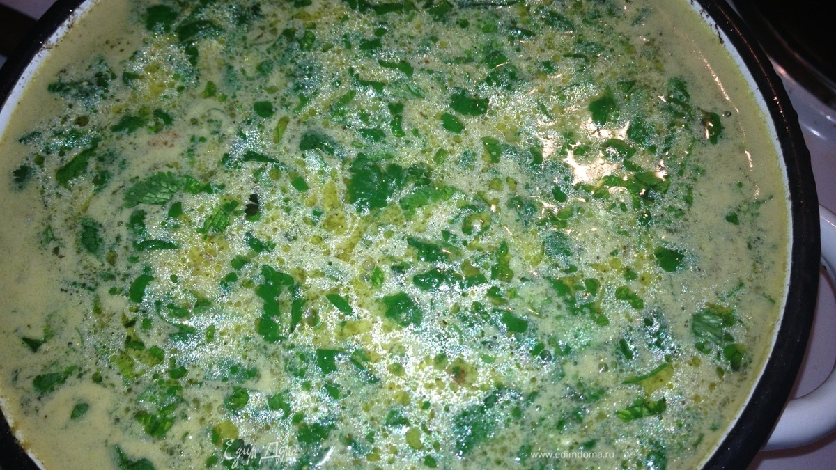 Добавляем смесь орехов и специй, обжаренный лук, соль и перец по вкусу, зелень кинзы. Заливаем соусом курицу, даем остыть и настояться (часов 12).