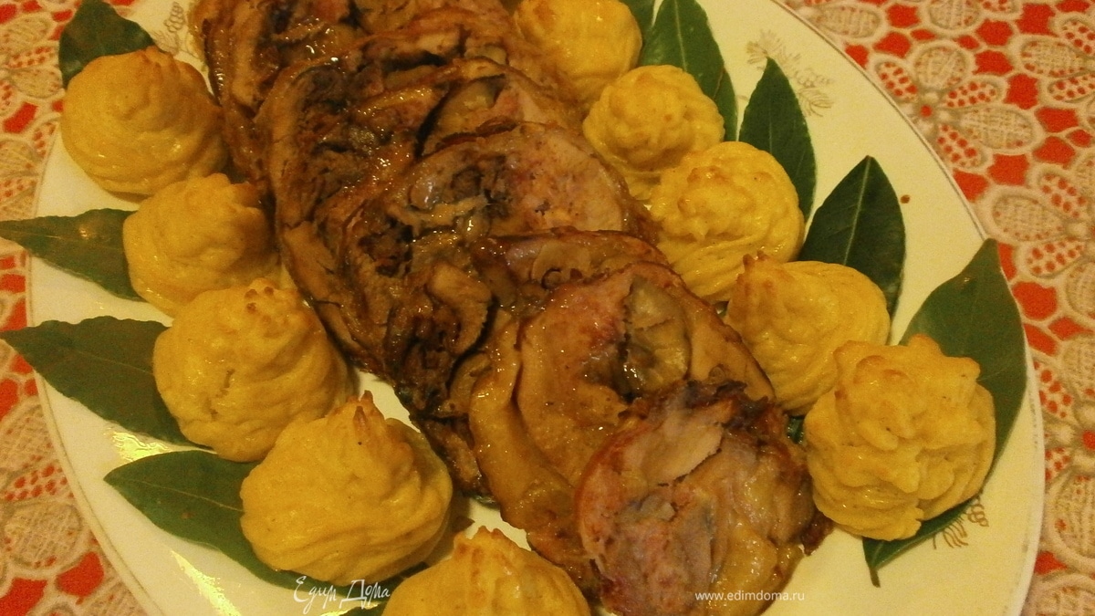 Рулет из цесарки, фаршированный каштанами, в беконе с гарниром из картофеля " дукесса" и мк по разделке тушки