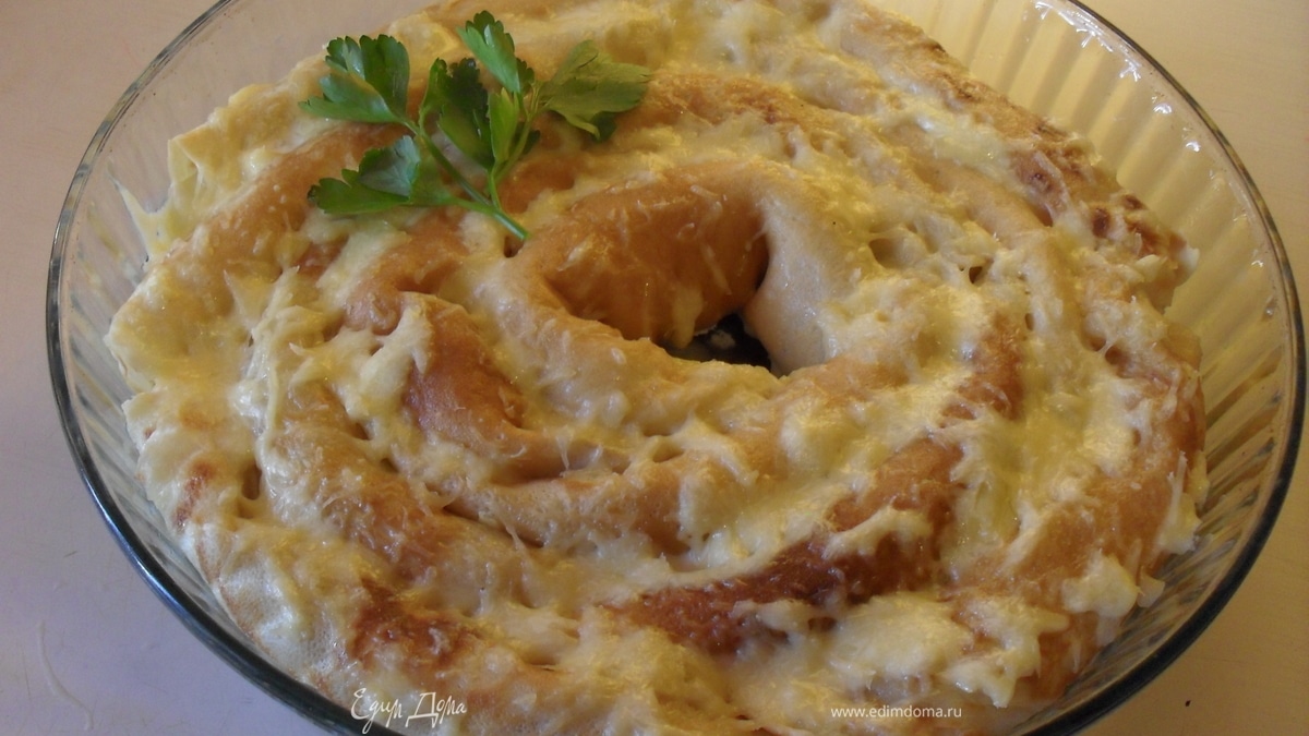 - Шаг 1Количество зависит от размера формы для выпечки. Испечь блинчики. Приготовить начинку:зеленый лук, вареные яйца посолить и слегка потушить на сливочном масле. Положить начинку на блинчики и свернуть в трубочки. Форму смазать маслом и плотно по кругу уложить блинчики. Сыр натереть на мелкой терке смешать со сливками и залить этой смесью блинчики. поставить в разогретую духовку (я ставила в микроволновку под гриль на 7 минут) пока сыр не расплавится. Вынуть дать слегка остыть, порезать на порционные куски и подавать.