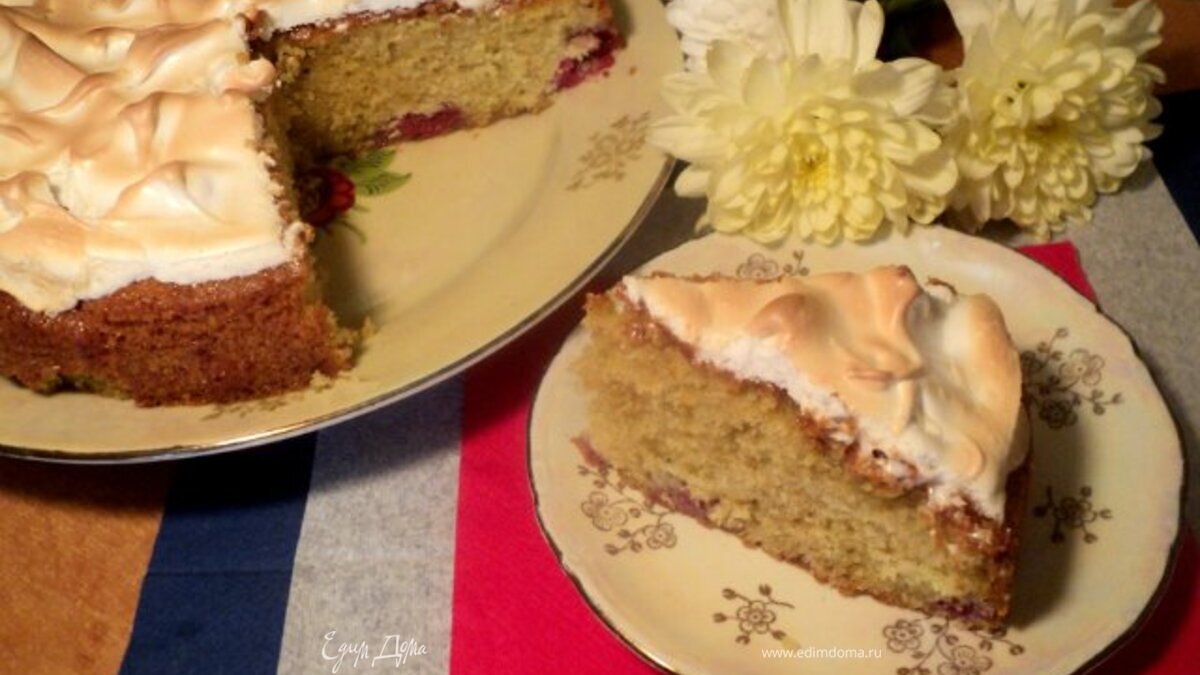 Приготовить меренгу: взбить белки с сахаром до устойчивых пиков. Выложить меренгу на пирог, сформировать ложкой пики или другие узоры. Поставить пирог под гриль при максимальной температуре на 1-2 мин. до образования золотистой корочки. Готовый пирог охладить. - Шаг 6