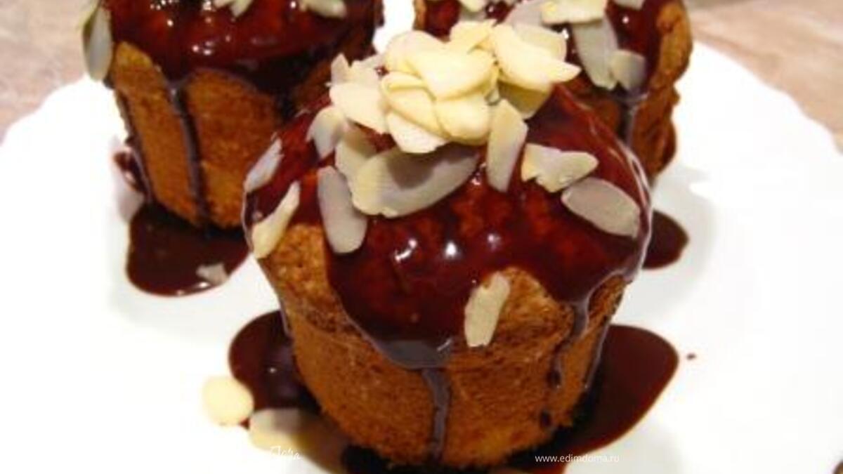 Яйца взбить с сахаром в светлую пышную массу. Просеять муку. Аккуратно перемешать. Влить 50 г растопленного масла, перемешать. Делайте это осторожно, чтобы масса не осела. Распределить тесто по формочкам на 2/3. Добавить шоколадные дольки. - Шаг 2Выпекать при 190°C 25 мин. Оставить на 5 мин в формочках. Остудить на решетке. Для глазури растопить на водяной бане шоколад с 25 г масла, дать ему немного остыть и полить пирожные. Посыпать миндальными лепестками. Приятного чаепития!