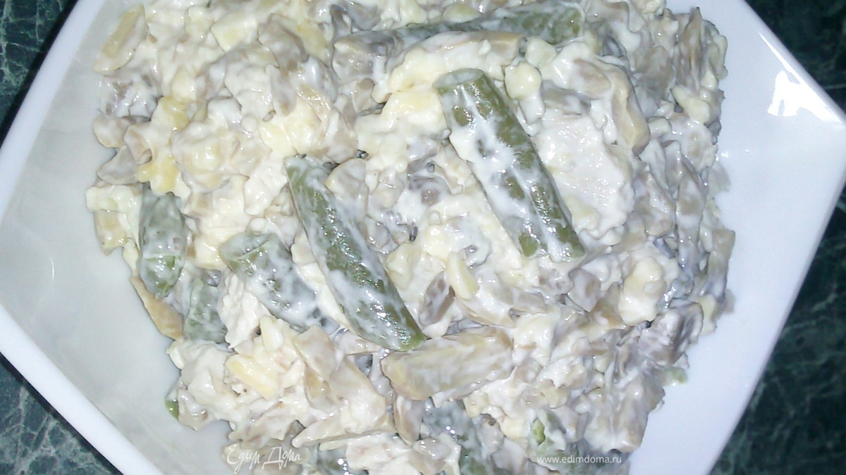 - Шаг 1Шампиньоны нарезать кусочками. Сыр натереть на крупной терке. Стручковую фасоль опустить в кипящую, подсоленную воду, как закипит, проварить 3 минуты и на дуршлаг.