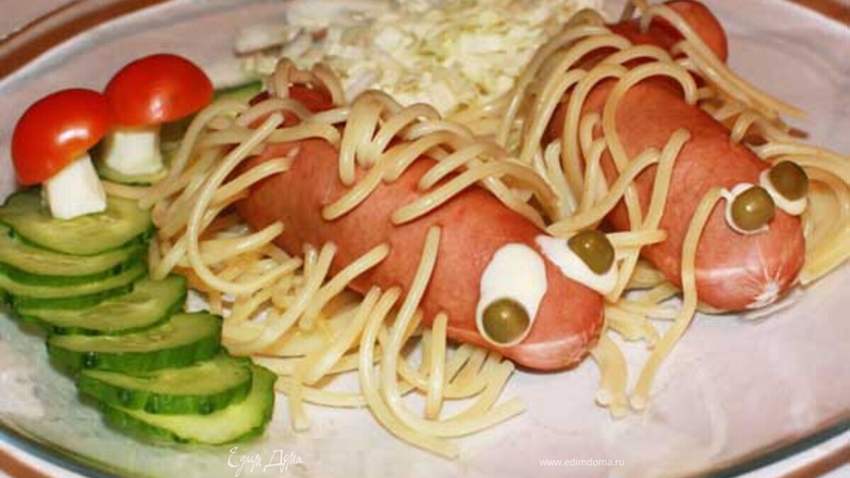 Распаковываем сосиски, чуть укорачиваем макароны. Начинаем протыкать сосиску макаронами. - Шаг 1Воду подсаливаем, доводим до кипения. Через несколько минут макароны начинают размягчаться, и сосиска погружается в воду. Через 5-7 минут получаем порцию "мохнатых" сосисок.