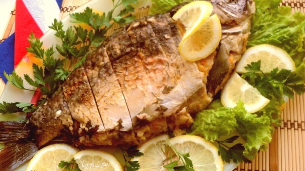 При подаче карпа порезать кусочками. украсить зеленью, лимоном, оливками. - Шаг 10