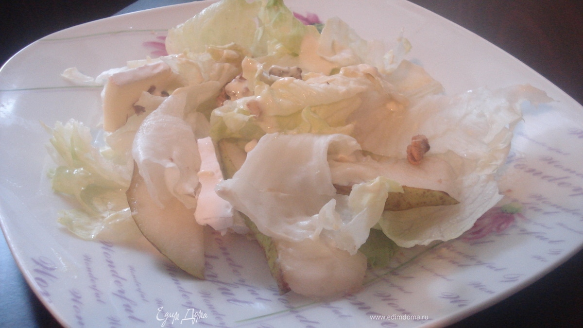 Это еще одна вариация салата из груши, сыра и орехов. Получается очень легкий и светлый салат.