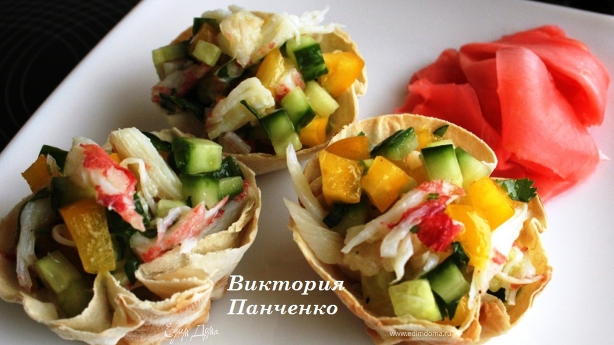 Эта закуска хороша для фуршета. Корзинки можно приготовить заранее и наполнить салатом непосредственно перед подачей... Можно использовать готовые тарталетки или чипсы, но я предпочитаю делать корзинки сама из армянского тонкого лаваша. Надеюсь, Черной водяной змее понравится мое угощение))))))))))))))))))
