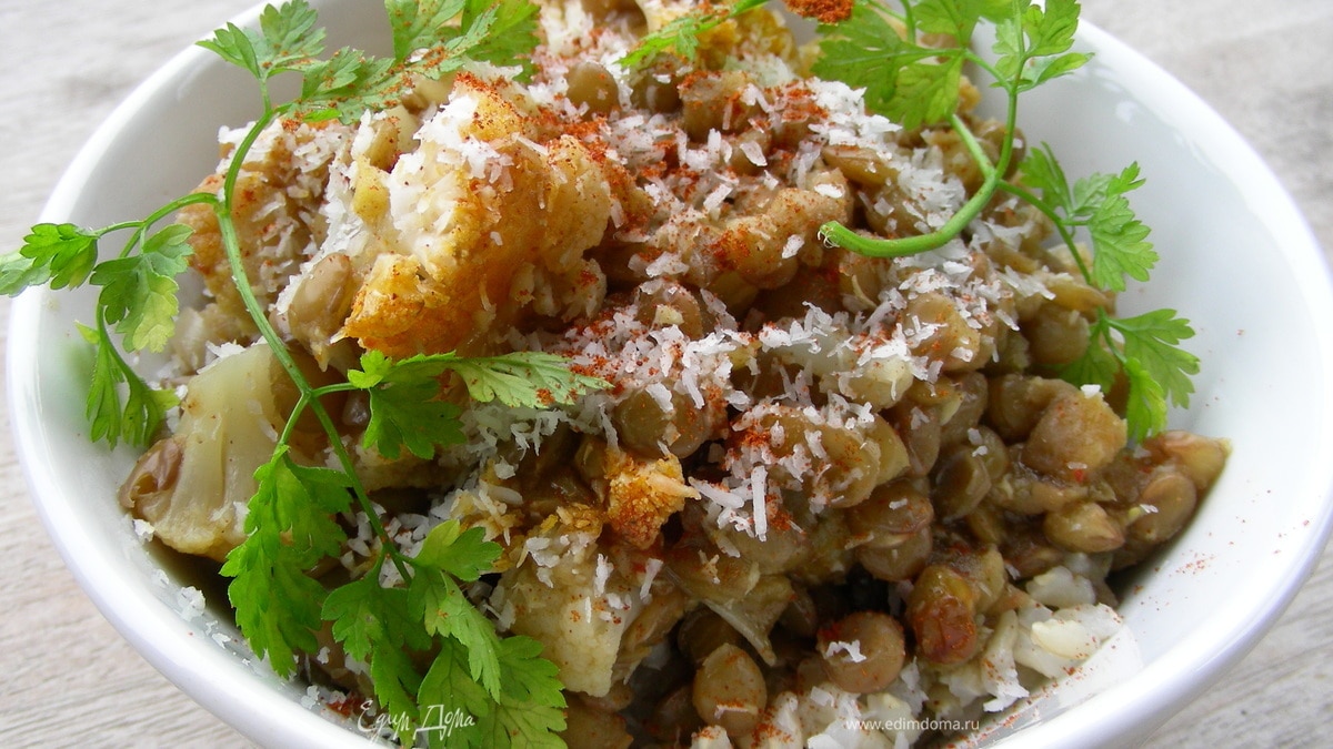 Я испытываю особую любовь к карри, поэтому блюда с ним частые гости на нашем столе) в английском журнале нашла интересный вариант карри с чечевицей, цветной капустой и кокосом)) я бы сказала классика жанра, легкий контраст создает свежая кокосовая стружка, которой посыпается готовое блюдо)) любителям карри должно прийтись по вкусу)) очень вкусно, сытно и согревает отлично)