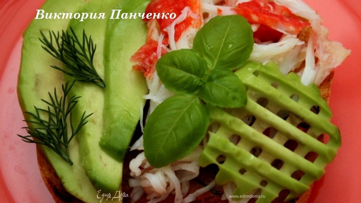 Выложить на хлеб ломтики авокадо и разобранное на волокна крабовое мясо. Украсить базиликом.