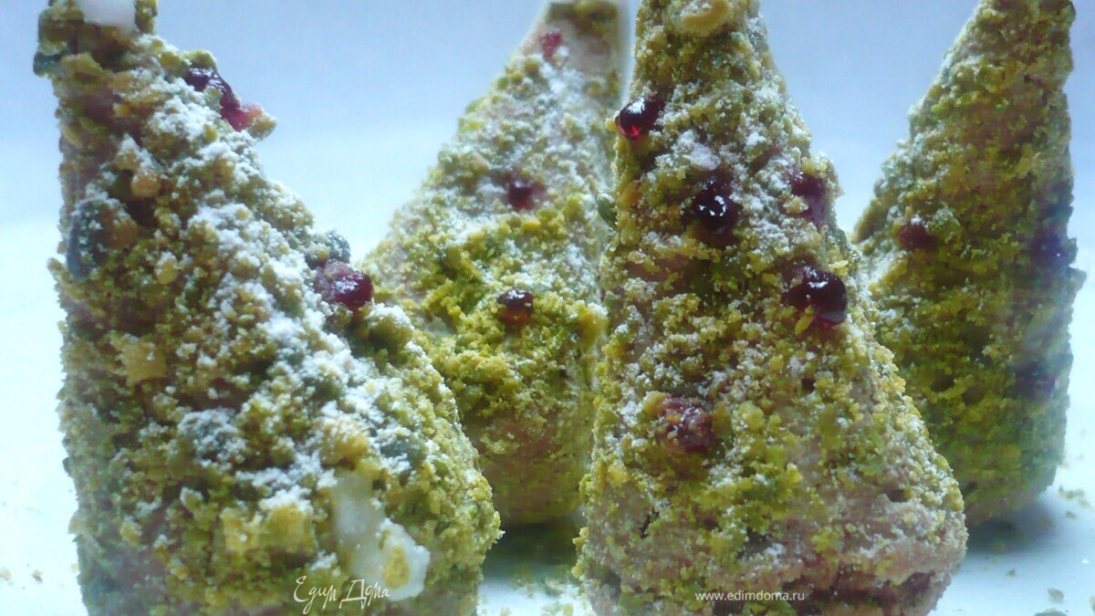 Наносим глазурь на елочку и обваливаем ее в фисташковой муке. Так поступаем со всеми елочками. - Шаг 8