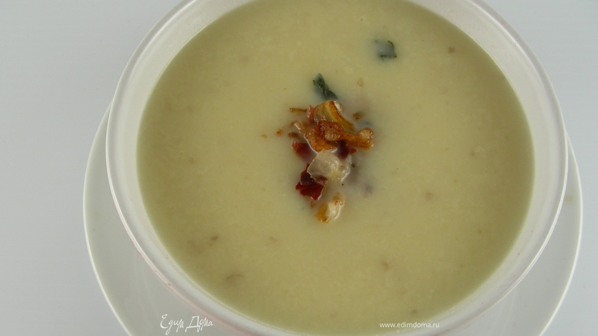 Крем-суп из сельдерея с зажаркой из лука, бекона и шалфея