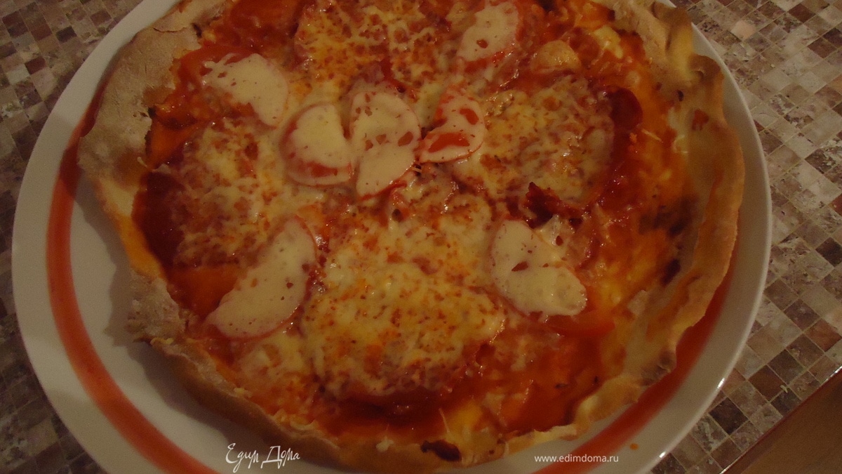 Дальше укладываем начинку: соус, колбаса, ломтики помидора, сыр. И запекаем до готовности примерно 12-15 мин. Готовую пиццу приправить орегано и тимьяном.