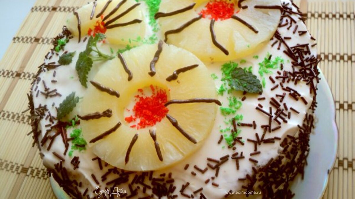 Бока торта обсыпать по желанию, я обсыпала шоколадной посыпкой. Верх украсила колечками ананаса, кокосовой стружкой. - Шаг 9