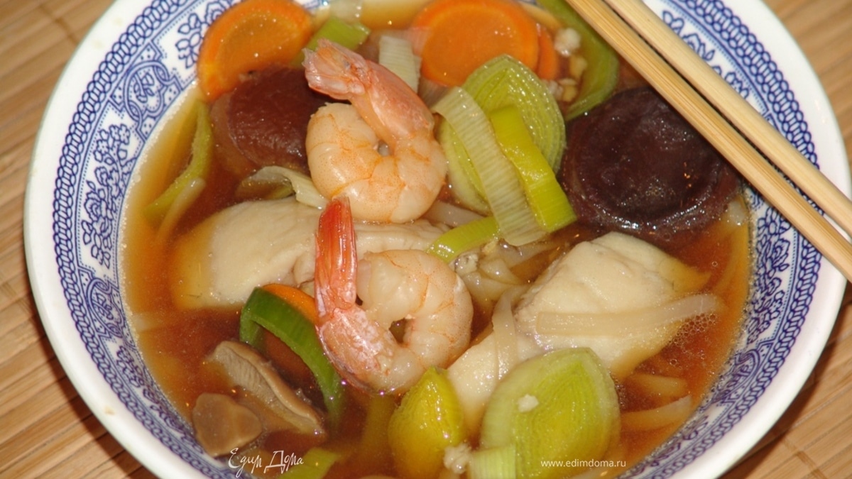 Лук-порей и морковку вымыть, почистить, нарезать кружками. Рыбу нарезать кусочками. Предварительно замочить шиитаке и рисовую лапшу. Лапшу прожарить на сковороде с растительным маслом до белого непрозрачного либо - золотистого цвета. Не переживайте, если лапша будет слипаться - в супе она разойдется. - Шаг 1