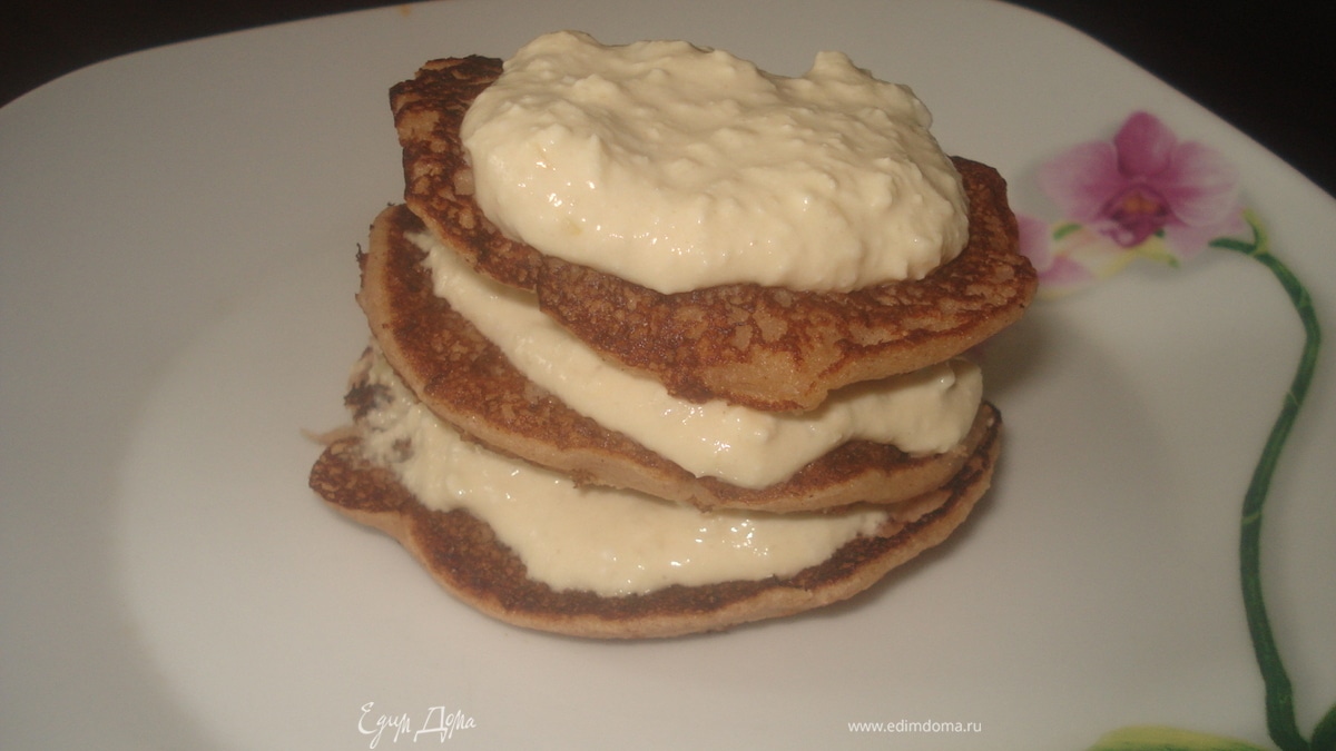 - Шаг 1Оладушки: Взбить немного яйцо с кефиром и солью, добавить гречневую муку и хорошо размешать. Пшеничную муку смешать с разрыхлителем и добавить к тесту. Тесто хорошенько размешать. Пожарить оладушки и выложить на бумажное полотенце. Соус: взбить в блендере 2 стебля сельдерея, брынзу, творог,сметану, горчицу и сливки. Оставшийся сельдерей порезать на мелкие кубики и смешать с соусом. Подача: Выложить горкой оладушки, смазанные соусом.