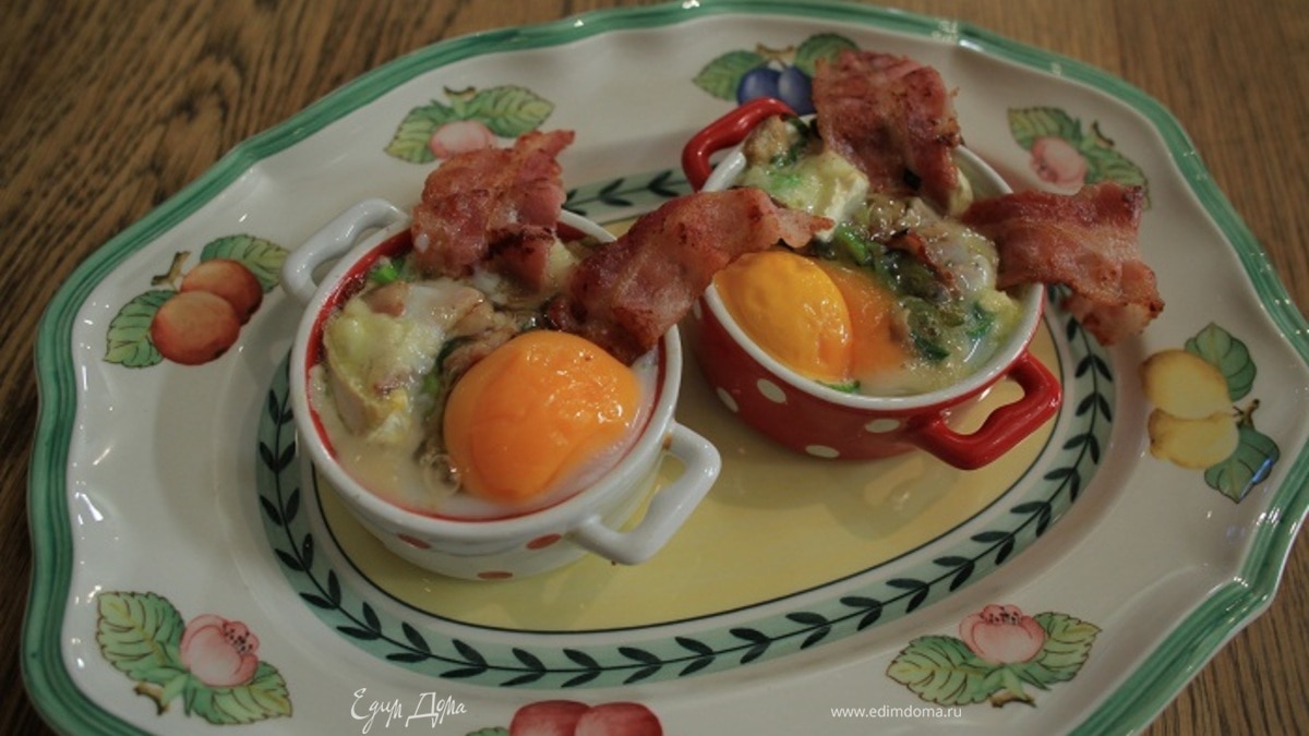 В две небольшие керамические формы выложить половину сыра, затем обжаренные грибы с беконом и луком, разбить по 1 яйцу так, чтобы желток не растекся, сверху разложить оставшийся сыр. - Шаг 8