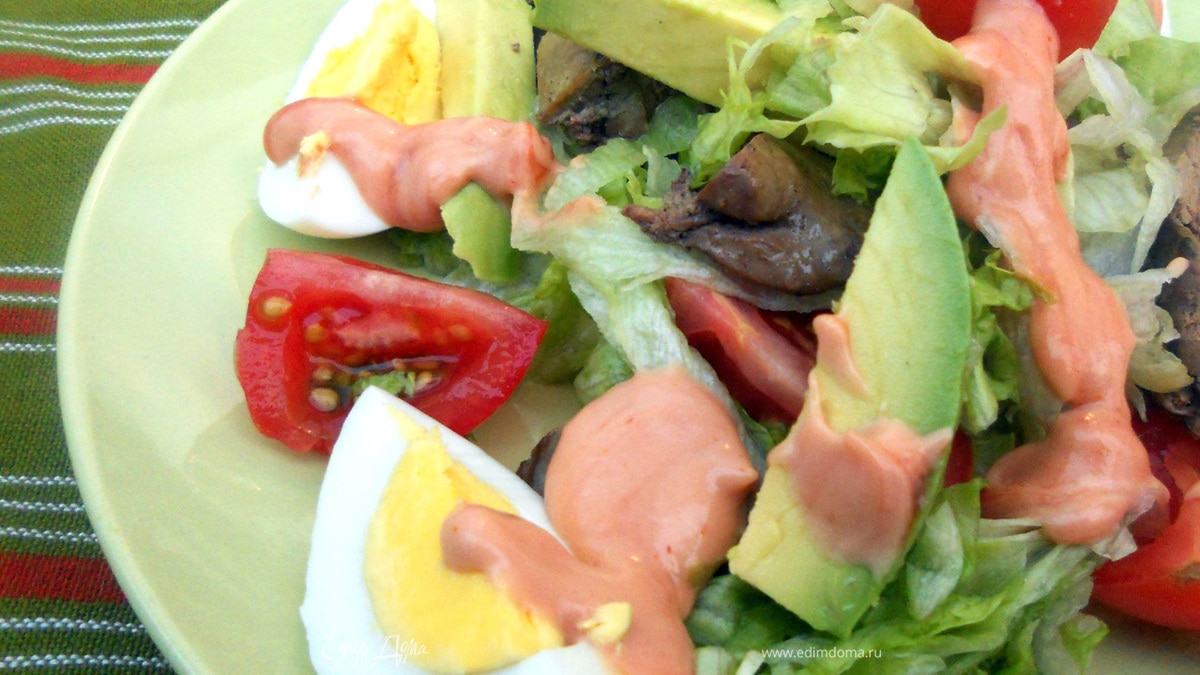- ПодготовкаВсе просто: печень промыть, обсушить, обжарить в сковороде с добавлением масла, на сильном огне, около 4-5 минут. В процессе присолить и поперчить. Снять с огня, немного остудить. В миске соединить порезанные айсберг, авокадо (можно сбрызнуть лимоном), черри. Выложить на терелки, поверх распределить теплую (а можно и холодную) печень и четвертинки яиц. Подавать с соусом, смешав майонез (йогурт), кетчуп и коньяк.