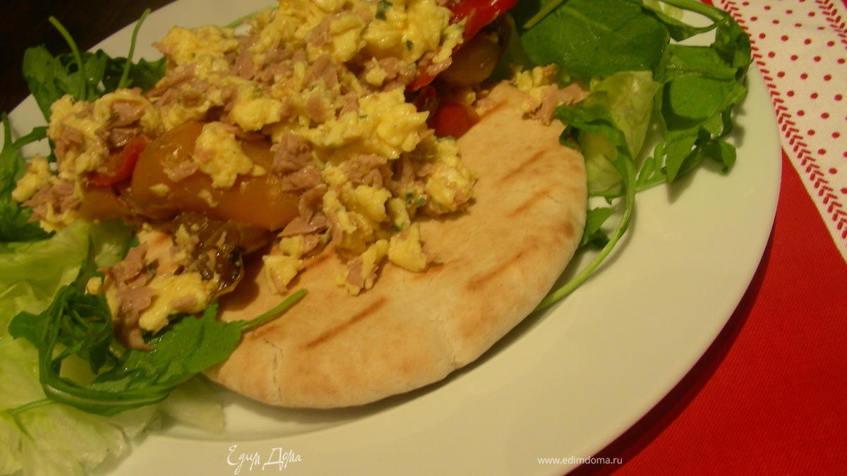 Яичница-болтунья с тунцом, маринованным перцем и лепешками пита