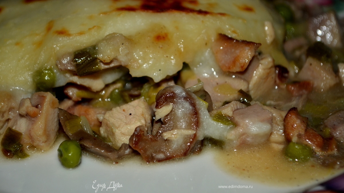 Разложим блюдо по горшочкам или в одно общее блюдо. Сверху выложим готовое картофельное пюре. - Шаг 3