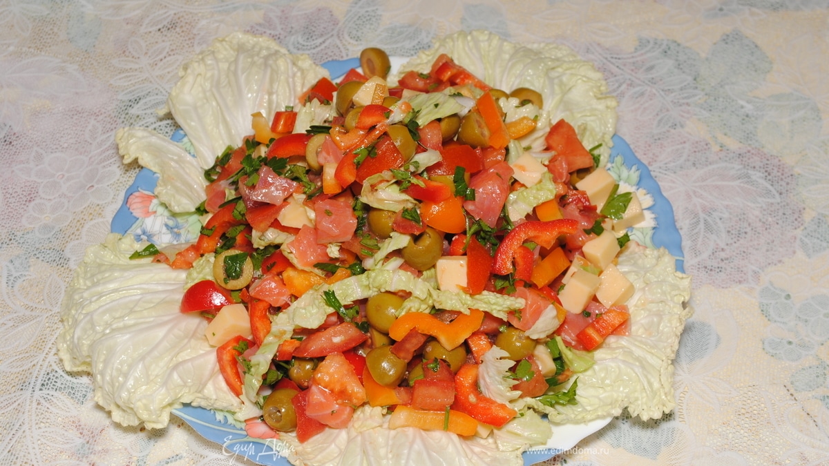 - ПодготовкаВсе нарезать кубиками, перец - длинными кусочками, зеленый салат или листья пекинской капусты - 5-7 листов - разорвать крупными кусочками, петрушка - пару веточек.