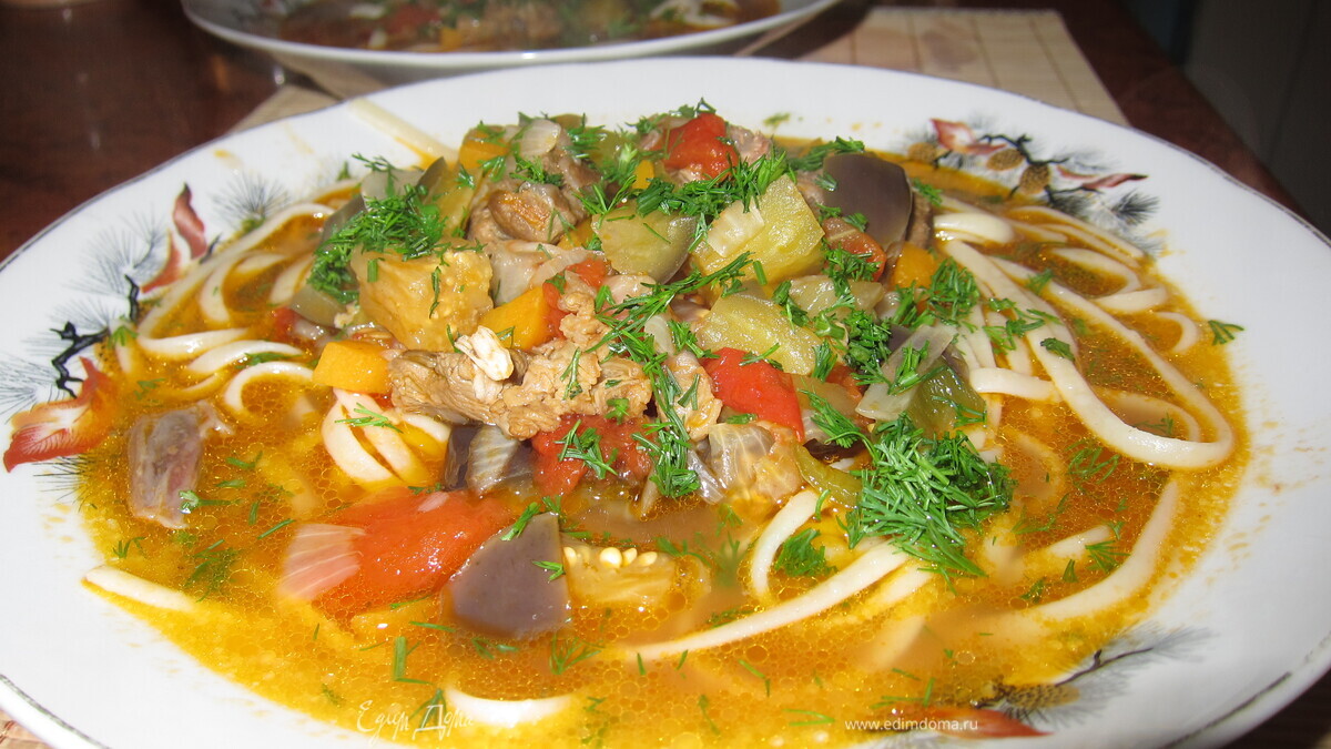 - Шаг 3Лапшу сварить и откинуть на дуршлаг,не промывая На горячую лапшу выложить мясо с овощами и добавить бульон. Посыпать свежей зеленью и подавать.