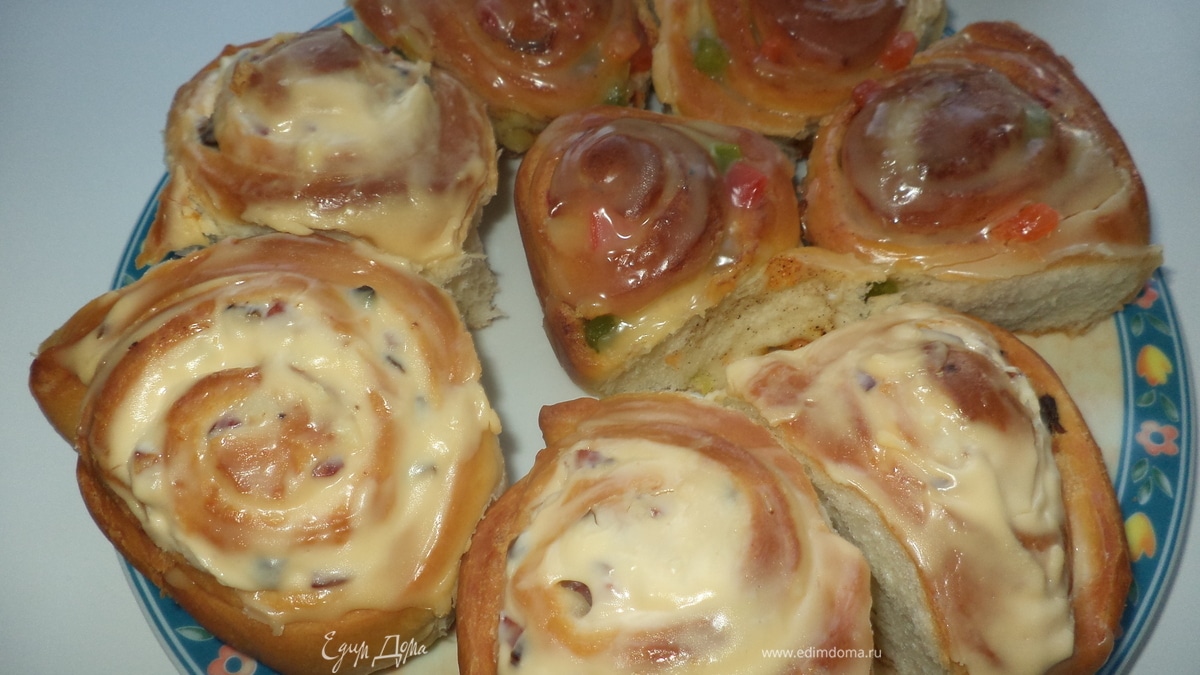 Я хочу вам предложить свою вариацию этой замечательной выпечки, я обещала сделать и показать одной нашей "соплемннице" Елене! Принимай Леночка!Тесто я взяла здесь на сайте,а так как у нас не очень любят корицу ,то пришлось придумывать и другие компоненты,я открыла для себя цветные цукаты,но их приходилось резать,и как то нынче летом я увидела меленькие 2-3 мм кубички-это то что нужно и для кексов и для булочек,можно брать просто изюм,лучше золотистый,а вот на 23 февраля мне нужно было угостить ребят ,которые работаю в ремонтном цехе,как то сладкая выпечка у меня не вязалась с этими "суровыми парнями",и мне пришла идея сделать синабонны с ветчиной и грибами-идея очень пришлась ко двору!А в качестве помадки я использую обычные плавленные сырки в ванночках-это просто находка,так как есть всегда и везде и совсем недорого,что тоже немаловажно,а когда уж делаю что- то с маскарпоне-конечно использую его.Для сладкой выпечки я мешаю сырки с сахаром или использую сладкие варианты-омичка,снежок или шоколадный,а для несладкой -простые или с ветчиной или грибами!Поверьте это нисколько не уступает дорогим сырам,они расплавляются и застывают очень красивой корочкой! Кстати очень неплохой вариант выпечки для фуршета,особенно с ветчиной!